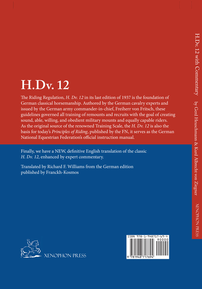 The Riding Regulation, H. Dv. 12 in its last edition of 1937 is the foundation of German classical horsemanship. Authored by the German cavalry experts and issued by the German army commander-in-chief, Freiherr von Fritsch, these guidelines governed all training of remounts and recruits with the goal of creating sound, able, willing, and obedient military mounts and equally capable riders. As the original source of the renowned Training Scale, the H. Dv. 12 is the basis for today's Principles of Riding, published by the FN, it serves as the German National Equestrian Federation's official instruction manual.